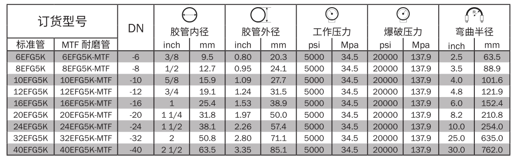 超耐磨外膠層 MTF(MegaTuff):適用于頻繁摩擦的工況且無需使用彈簧或尼龍護套,耐臭氧、紫外線及老化性能,按照 ISO 6945 耐磨測試標準,MTF 外膠比標準膠管外膠耐磨 300 倍